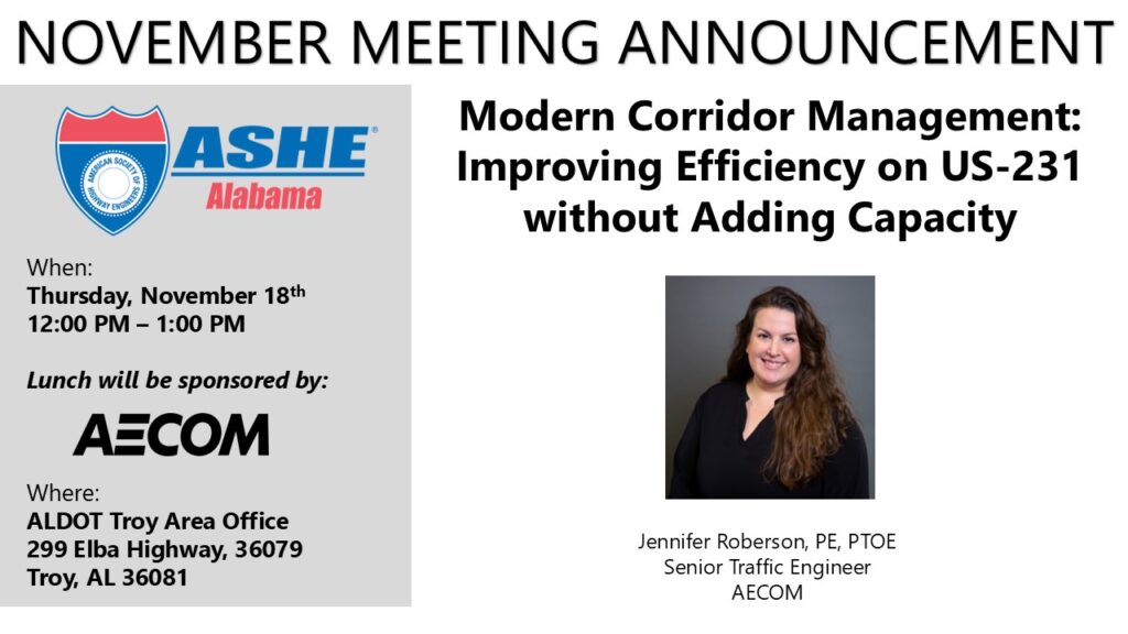 Alabama Section offers networking, development, and various other opportunities within the transportation industry. ASHE provides a way for members and professionals in the highway industry to support education and innovation.